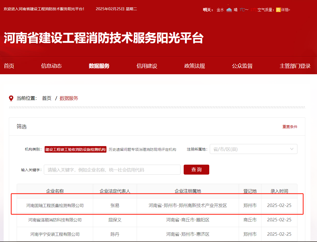 熱烈祝賀河南固瑞工程質(zhì)量檢測(cè)有限公司入冊(cè)河南省建設(shè)工程消防技術(shù)服務(wù)陽(yáng)光平臺(tái)?。?!